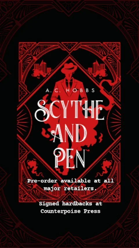 Scythe and Pen, a dark fantasy novel set in the Jazz Age, released January 12, 2024 from Counterpoise Press.