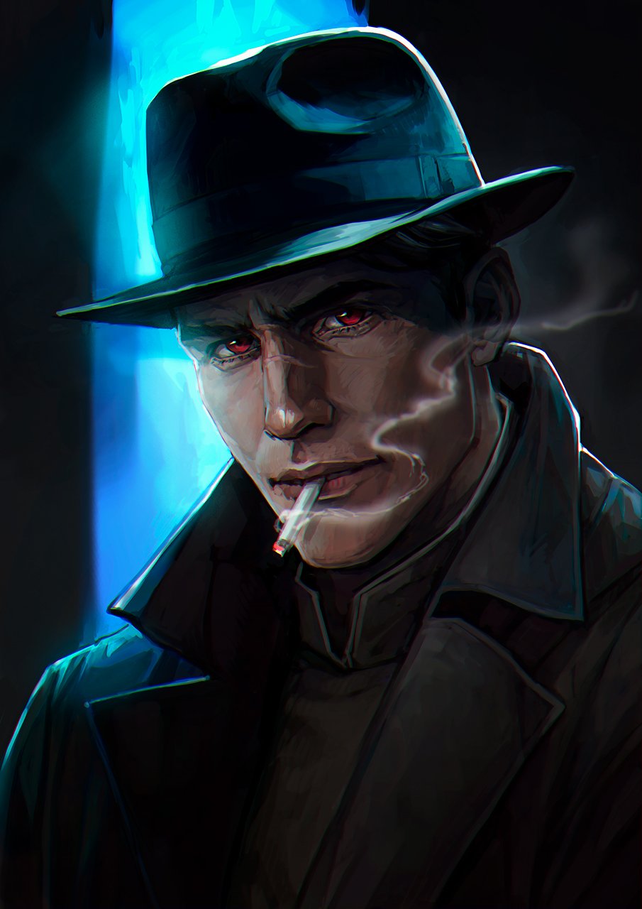 “A broad, tall man melted from the black. His appearance was like the slow drawing of a knife: glittering and lethal. A snapbrim fedora obscured his features. A cigarette slid to the corner of his mouth.”