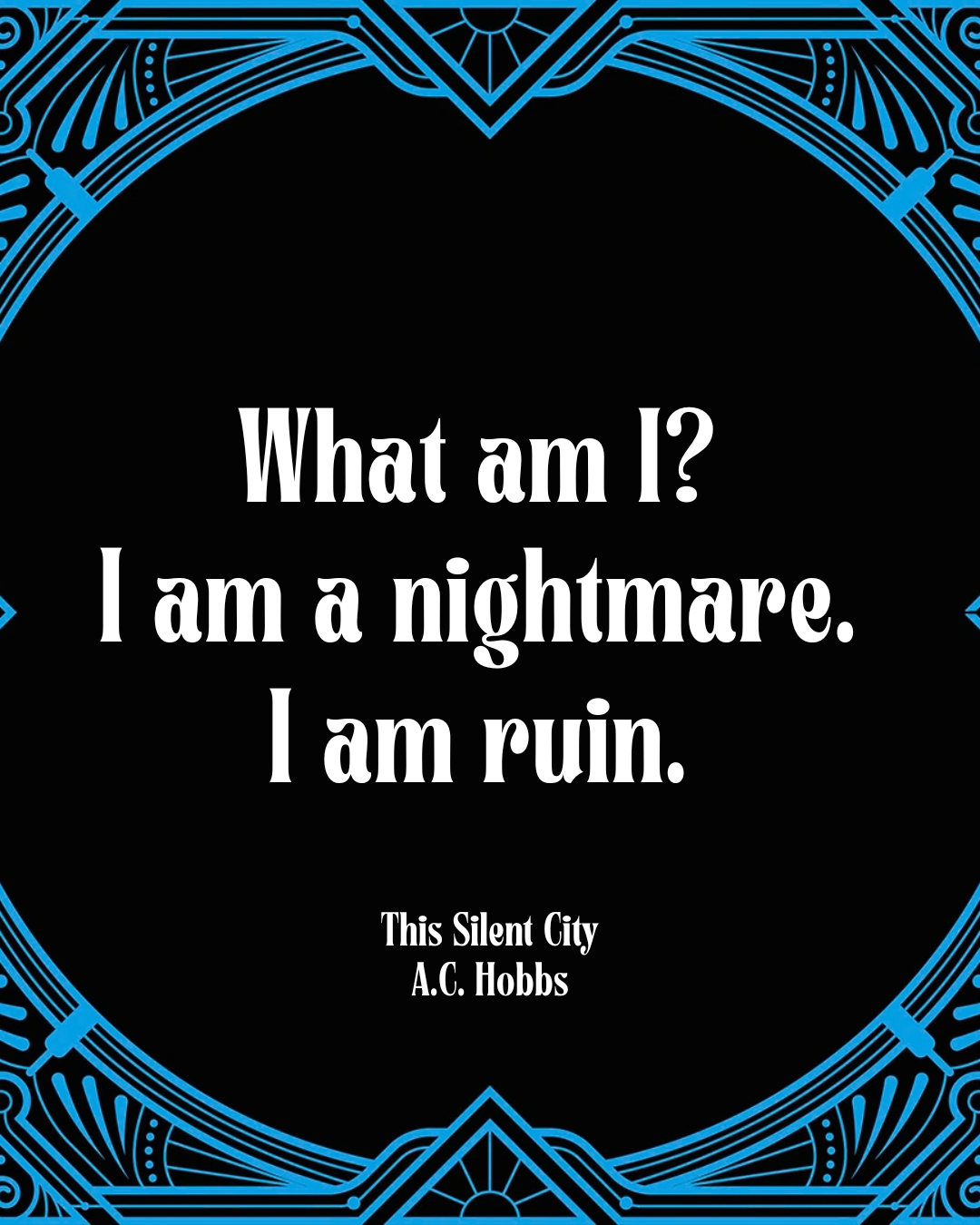 “A broad, tall man melted from the black. His appearance was like the slow drawing of a knife: glittering and lethal. A snapbrim fedora obscured his features. A cigarette slid to the corner of his mouth.”